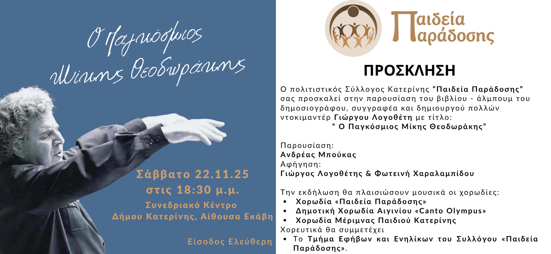 Μια πολιτιστική εκδήλωση με πλούσιο πρόγραμμα αφιερωμένη στη συμπλήρωση των 100 χρόνων από τη γέννηση του μεγάλου μουσικοσυνθέτη Μίκη Θεοδωράκη.