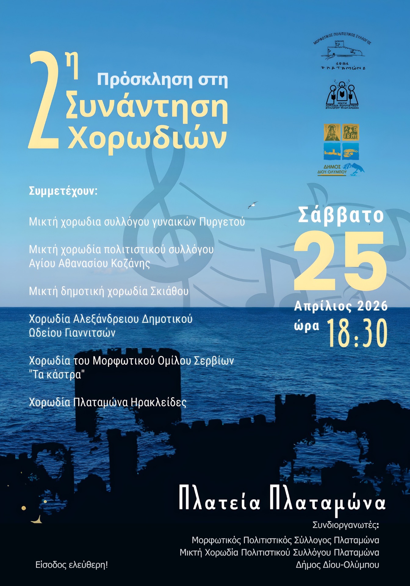 2ο Φεστιβάλ Χορωδιών στον Πλαταμώνα το Σάββατο 25 Απριλιου και ώρα 18:30 στην κεντρική πλατεία του Πλαταμώνα.